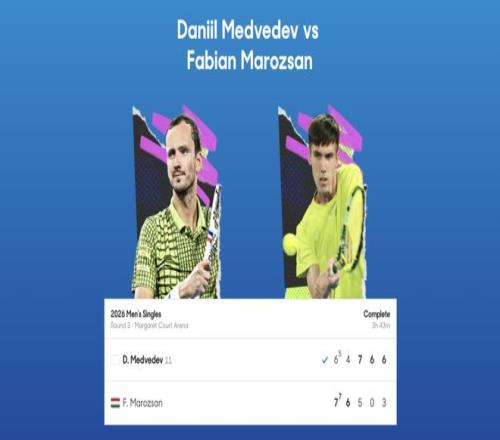 澳網(wǎng)男單第三輪,三屆賽會亞軍、11號種子梅德韋德夫上演“輸二贏三”,以6-7(5)、4-6、7-5、6-0、6-3逆轉(zhuǎn)匈牙利選手毛羅然,成功躋身16強,后者則是連續(xù)三年止步32強。