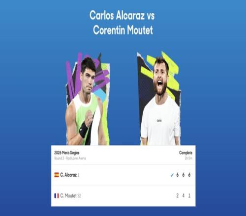 澳網(wǎng)男單第三輪,頭號種子阿爾卡拉斯耗時2小時5分鐘直落三盤以6-2、6-4、6-1輕取32號種子、法國人穆泰晉級16強。