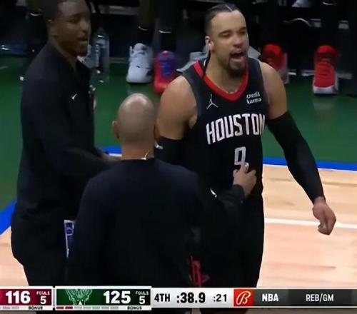 在對(duì)陣雄鹿的比賽中,狄龍因?yàn)椴粷M裁判判罰與其理論時(shí),火箭主帥烏度卡沖入場(chǎng)內(nèi)為狄龍維權(quán)。