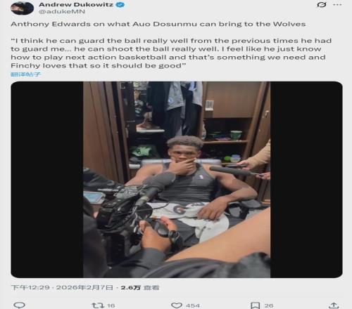 北京時(shí)間2月7日,NBA常規(guī)賽,森林狼115-119不敵鵜鶘。愛德華茲賽后接受采訪談到新援阿約-多森姆:“他防守能力很強(qiáng),投籃也很準(zhǔn),這對(duì)我們來說是很棒的補(bǔ)充?!敝鲙浄移嬲f:“如果我不把多森姆排進(jìn)輪換前8,我可能會(huì)被解雇。”