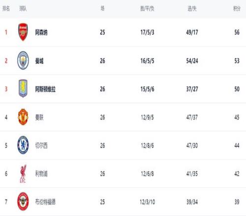 在積分榜上,阿森納以56分高居榜首,戰(zhàn)績(jī)是17勝5平3負(fù)。曼城贏球之后,繼續(xù)緊追阿森納,只落后阿森納3分,屈居第2。不過,曼城比阿森納多踢1場(chǎng)。同樣贏球的阿斯頓維拉拿到50分,排名第3,理論上依然有沖擊冠軍的希望。曼聯(lián)45分排名第4。第5的切爾西拿到44分,僅僅落后曼聯(lián)1分。利物浦贏球之后,總積分達(dá)到42分,排名第6,縮小與曼聯(lián)切爾西的差距。爭(zhēng)四的形勢(shì)非常激烈,幾支豪門的差距微乎其微。