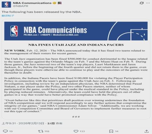 北京時(shí)間2月13日上午9點(diǎn)半,NBA開出重磅罰單:爵士被聯(lián)盟罰款50萬(wàn)美元,步行者被罰款10萬(wàn)美元。此前幾場(chǎng)比賽中,爵士在第四節(jié)開始之前換下3J和馬爾卡寧等主力球員。步行者則是違規(guī)輪休西亞卡姆,聯(lián)盟認(rèn)為他可以出場(chǎng)。