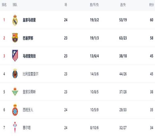 在積分榜上,皇馬以60分登上榜首位置。而巴薩則掉到了第2的位置。巴薩總積分是58分,比皇馬少了2分。不過,巴薩少踢1輪。如果接下來巴薩能夠擊敗赫羅納,那么還是能夠重登榜首。馬競(jìng)只拿到45分,排名第3。第4的是比利亞雷亞爾,也是45分?;始邑惖偎挂?8分排名第5。西班牙人以35分排名第6。