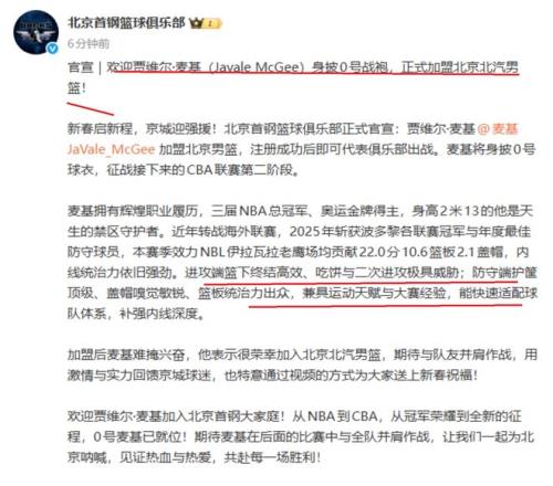 周琦迎來爭(zhēng)冠好幫手!北京隊(duì)正式宣布:簽約三屆NBA總冠軍,奧運(yùn)會(huì)金牌得主,2米13內(nèi)線悍將賈維爾·麥基!