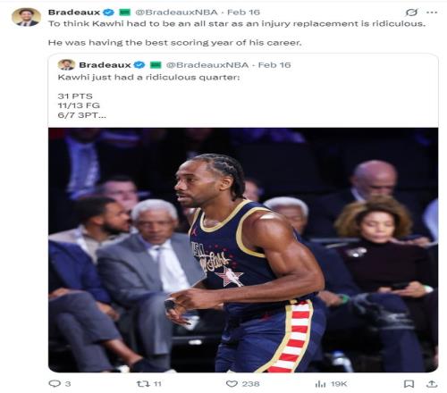休媒Bradeaux寫道:要說倫納德能在全明星沒上受傷的情況下進(jìn)入那太荒謬了。不過他這一年在得分方面的確極為出色,這是他職業(yè)生涯最出色的一個(gè)賽季。