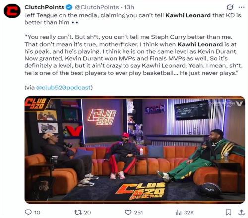 前NBA球員杰夫-蒂格也談到了倫納德本賽季的表現(xiàn),他表示:你們不能說凱文-杜蘭特比倫納德更強(qiáng)。倫納德處于巔峰狀態(tài)且健康時(shí),我認(rèn)為他的水平跟杜蘭特是一致的,雖然杜蘭特贏得了MVP與FMVP,所以確實(shí)有一點(diǎn)差距,但說倫納德不比他差也不算離譜。我是說,他真的是NBA歷史上最頂級的球員之一…… 就是老不打比賽。