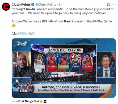 前NBA球員安托萬-沃克談到了小卡的表現(xiàn):我覺得卡哇伊在全明星的表現(xiàn)非常好,在家鄉(xiāng)父老面前為球迷貢獻(xiàn)一場精彩的表演,我們需要全明星重新變得具有競爭性。