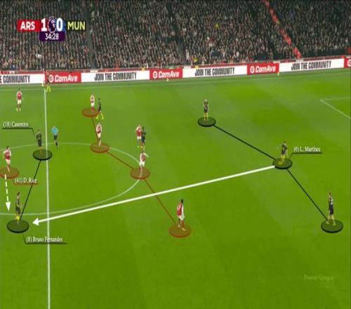 曼聯(lián)的主要套路還是二打二的配合,像3-2擊敗阿森納之戰(zhàn),B費(fèi)和多古就這樣突破中路,攻入了球隊(duì)的第二球。