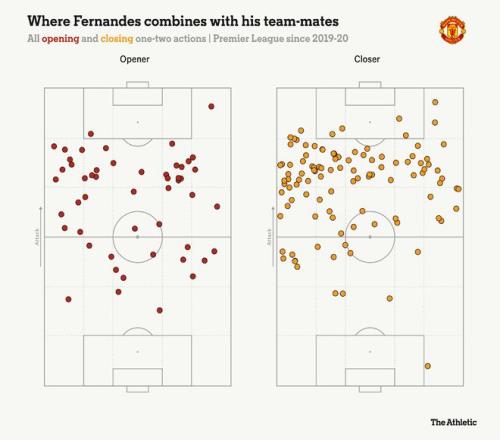 2019年8月以來(lái),只有利物浦的安迪·羅伯遜和曼城的貝爾納多·席爾瓦進(jìn)行的二過(guò)一配合次數(shù)比B費(fèi)多。與B費(fèi)默契最好的,是過(guò)去的拉什福德,以及如今的邊后衛(wèi)盧克·肖和迪奧古·達(dá)洛。