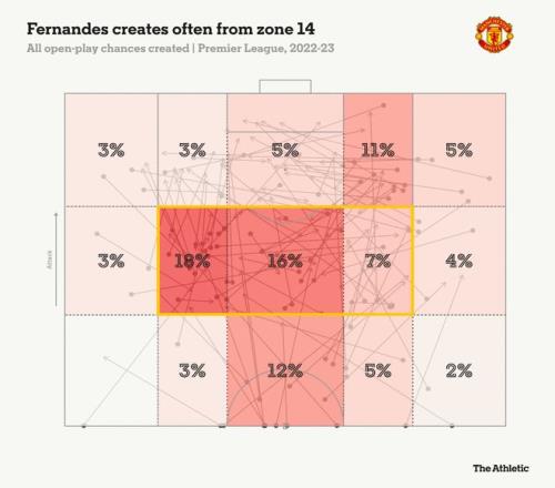 在教練和分析領(lǐng)域,人們將球場(chǎng)劃分為6行3列共18個(gè)矩形區(qū)域,對(duì)方禁區(qū)外中路的位置被稱為「14 區(qū)」,是創(chuàng)造進(jìn)攻機(jī)會(huì)的關(guān)鍵所在。2020/21賽季至今,B費(fèi)是英超聯(lián)賽中14區(qū)創(chuàng)造機(jī)會(huì)和助攻次數(shù)最多的球員,分別有206次和25次。