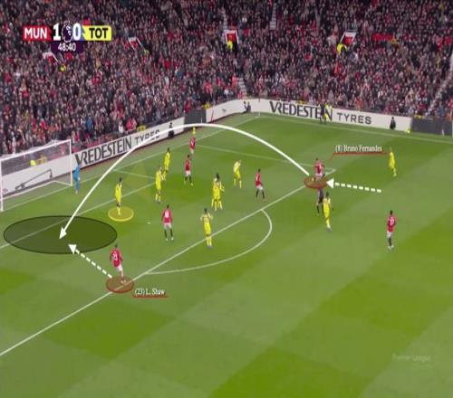 在2-0擊敗熱刺的比賽里,B費(fèi)的跑位迷惑了熱刺左后衛(wèi)德斯蒂尼·烏多吉,隨后傳給卡塞米羅,「胖虎」與姆貝莫配合未果,B費(fèi)又率先做出反應(yīng),第一時(shí)間傳中給左側(cè)的盧克·肖,后者助攻阿馬德·迪亞洛得分,可惜因?yàn)樵轿槐慌袩o(wú)效。