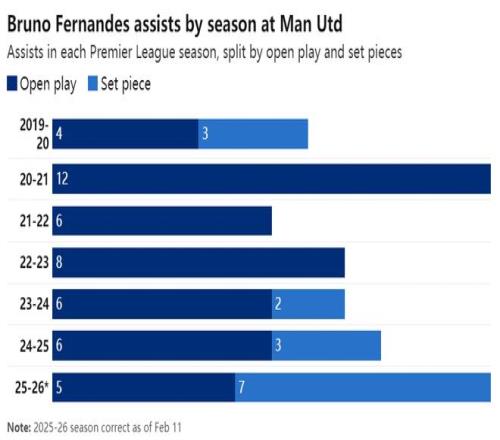 與個(gè)人巔峰時(shí)期相比,現(xiàn)在B費(fèi)的直塞少了,但定位球助攻增加。2024年8月至今,他通過(guò)角球和任意球助攻10次,在聯(lián)盟中名列前茅。同期,他的運(yùn)動(dòng)戰(zhàn)助攻11次,二者幾乎平分秋色。