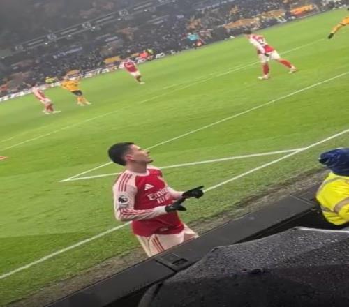 但在補(bǔ)時(shí)階段,馬丁內(nèi)利的行為讓他自食惡果。加布里埃爾和戴維-拉亞在防守狼隊(duì)傳中時(shí)相撞,薩穆埃爾-埃多齊的射門擊中立柱,彈在卡拉菲奧里身上后滾入球門。