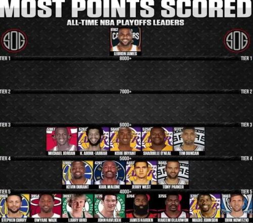 第三個,詹姆斯季后賽總得分8162分。大家常說,季后賽是檢驗巨星成色的舞臺,每一場比賽都是生死戰(zhàn),強度拉滿,老詹能攢下這個分數(shù),靠的是19次季后賽、280多場出場,還有場均近30分的穩(wěn)定輸出。現(xiàn)役球員中,最接近詹姆斯的球員是杜蘭特,他的季后賽得分為4985分,差了快3000多分,之后的庫里、哈登、倫納德差距更多!年輕球員中,塔圖姆季后賽總得分來到2936分,與詹姆斯差距5000多分,按照塔圖姆的季后賽的平均數(shù)據(jù)來說,每個賽季打13.67場比賽,場均24.1分,每個賽季季后賽合計拿329分,要再拿5000多分,需要塔圖姆再打16年的季后賽,且需要保證自己年年巔峰!顯然,詹姆斯的這份紀錄,后人只能仰望。